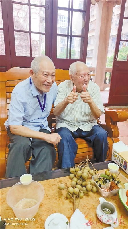 这是重阳节前夕的一次特殊聚会。10月20日下午,在近百年历史的建筑——市区大路街50号爱国名医陈展如故居二楼,两位年逾九旬的老人热情握手不愿放下,互相轻轻拍打对方的肩膀,亲昵地叫对方“文波”,场面十分感人。