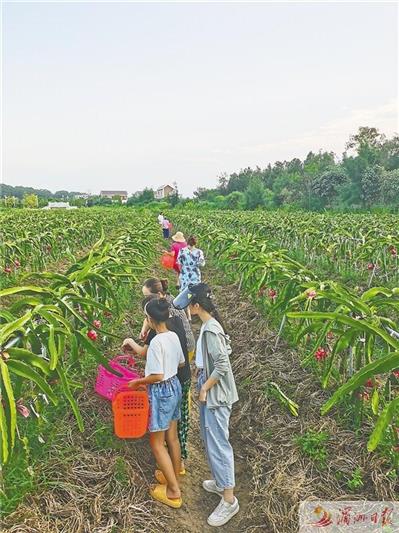 记者在现场看到,一排排果树整齐排列在田垄上,藤蔓上挂满了色泽艳丽的火龙果。孩子们在家人的陪伴下开心采摘(如图)。