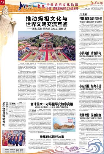 本报讯 12月18日,第七届世界妈祖文化论坛分论坛之一“妈祖文化与海丝交流合作”主题论坛在世界妈祖文化论坛永久会址举行。自然资源部海岛研究中心主任、党委书记张海峰,省自然资源厅副厅长郑鸿,市人大常委会副主任吴宗兴,以及知名专家学者等出席。