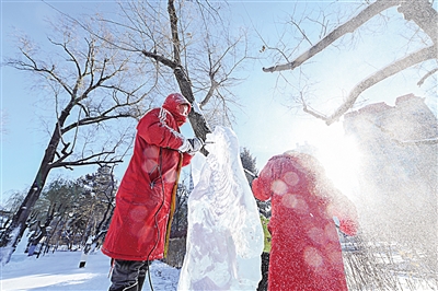 12月30日,在哈尔滨市兆麟公园,参赛选手在进行冰雕创作。当日,在黑龙江省哈尔滨市,参加第17届全国大学生冰雕艺术设计创作大赛的冰雕选手在严寒中进行艺术创作。 新华社记者 王松 摄
