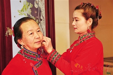 只见福首家中大厅前置办香案,围系着金玉满堂桌裙的长案上红烛高燃,供奉果盒馔盒、五果六斋、三牲五礼等供品;亲戚挑来红盘担、红幛、红炮团等贺礼;大吹笙长奏,古雅高亢,夹杂着炮竹声响中,全家老少衣色一新,擎香跪立迎神;其间妯娌、姑嫂、婆媳一身红衣红裤套褂裙,一致盘起复古发髻,簪上红绸花、珠翠及经年压箱底的牡丹摇头钗、鱼钗、头角银花、凤钗等头饰;耳畔间分别戴着福禄寿三多、24叶长银穗子、鱼龙、蟠桃式的耳铛,一枚枚轻巧灵动,别致流丽,她们庄重恭敬地行三跪九叩大礼,伏祈人寿年丰,喜乐长安;颔首低眉间,写满虔诚与敬畏,让人无不为之动容。