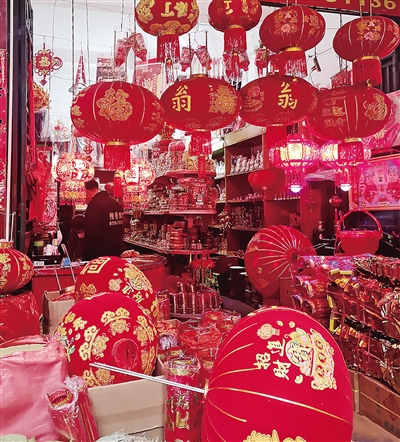 红灯笼、红中国结、红挂历、红春联、红挂件、红篮子、红盘子、红鞭炮……城厢区筱塘市场一民俗用品店里,摆满了各种各样喜庆的春节用品,红红火火迎新春。