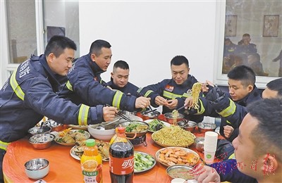 1月21日,在福建省龙岩市消防救援支队,消防队员在吃年夜饭。当日是除夕,全国各地的人们或与亲朋好友一起、或是仍在坚守岗位,用各种方式享受欢聚之乐,一起吃一顿年夜饭,共庆新春到来。