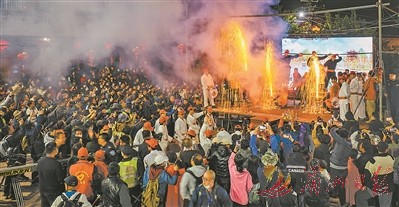随着几声响亮的铳声,“冲花”表演正式开始。点燃的烟花喷出2米多高的焰火,表演者赤膊上阵,身体前倾冲进喷溅的火花,挥舞着双臂将烟花往自己身上、头上揽。其口张开着,似吃非吃焰火,然后吐出烟雾……数次下来,依然面不改色,身体毫发无伤。围观群众啧啧称奇。