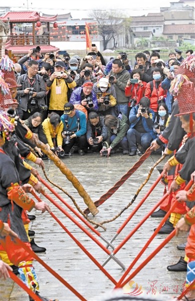 在涵江区白塘镇洋尾村,舞狮、伡鼓、皂隶舞、十音八乐等民俗活动分散在村落间热闹演绎。记者在现场看到,摄影家们肩背大背包,手扛三脚架,脖子上挂着“长枪短炮”,一听到铿锵锣鼓声,就麻利追上来,占据有利位置,航拍、直播齐上阵,抢拍下精彩场面(如图)。