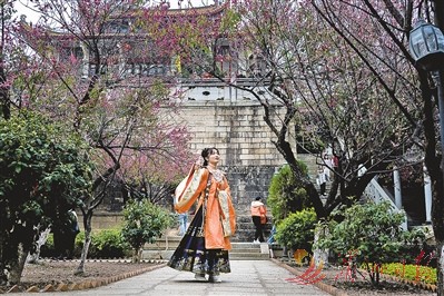 春上枝头,市区梅峰光孝寺内梅花盛开,香气盈怀,沁心入脾,吸引古风爱好者着一身精美霓裳前来赏梅,行走其间,随手一拍就是一张意境唯美的古风大片。 全媒体记者 杨怡玲 摄