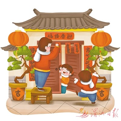 我先把去年的春联撕掉,然后认真地把门擦一遍,再把“福”字的背后粘上双面胶,倒着贴到门扇上。我记得妈妈说过,这样贴寓意“福到”。该贴联了,这下我犯难了,哪一个是上联呢?我突然想起老师说过“对联讲究平仄,上联的尾字是仄声”。于是,我判断“人顺家顺前程顺”是上联,贴在左边,“福多财多喜庆多”是下联,贴在右边,最后贴上横批“一帆风顺”。