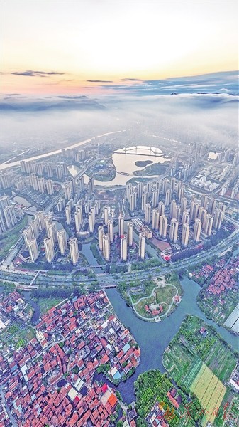 2月14日傍晚,航拍下的木兰溪畔,云雾缭绕,如诗如画。图为玉湖新城与绿心古村落交相辉映,展现出山水诗画生态韵城的美丽景象。 全媒体记者 蔡昊 摄