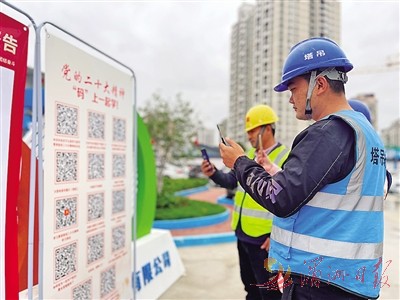 日前,城厢区经济发展集团有限公司前往中建海峡厦门公司揽月豪庭工程项目现场,开展“宣传二十大精神,新春送温暖”慰问活动,关爱奋斗在一线的劳动者。图为工人通过扫码学习党的二十大精神。