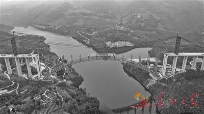 正在进行桥面系施工的德余高速乌江特大桥。近日,德(江)余(庆)高速乌江特大桥施工进展顺利,大桥建设进入桥面系施工阶段。德余高速乌江特大桥位于贵州省思南、石阡、凤冈三县交界处,大桥全长1834米,主跨504米。 新华社记者 陶亮 摄