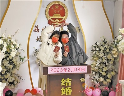 本报讯 2月14日是婚姻登记小高峰,不少情侣来到荔城区婚姻登记处办理结婚登记。当天,以“婚俗新风 幸福起航”为主题的荔城区持续推进移风易俗文明实践情人节特别活动也在这里温馨举行。