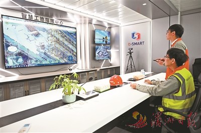 走进智慧工地指挥中心,一个数据集成大屏映入眼帘,两侧副屏分别展示全景鹰眼和热成像公共视频画面。“将科技融入工程,实现全方位智能化管理,改过去静态抽查模式为动态实时管控,节省人力,还更精准。”该指挥中心负责人王正钎边演示操作,边向记者介绍。屏幕上,能俯瞰整片工地施工动态,也可以拉近观看施工细节。打开“地盘相册”,可以调出一个地块不同时段的画面“找不同”,“有图有真相”地了解工程进度。