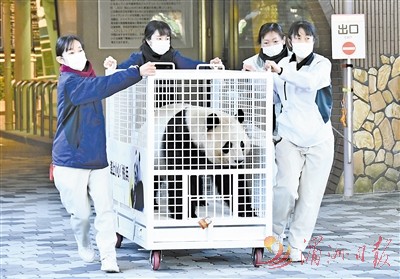 2月22日,在日本和歌山县白浜町的“冒险世界”乐园,工作人员运送大熊猫“桃浜”。22日,载着白浜大熊猫家族的“顶梁柱”——“永明”和它的双胞胎女儿“樱浜”“桃浜”的大卡车缓缓离开“冒险世界”乐园园区驶向关西国际机场,这3只大熊猫将由“冒险世界”乐园园长今津孝二全程护送前往成都大熊猫繁育研究基地。 新华社记者 岳晨星 摄