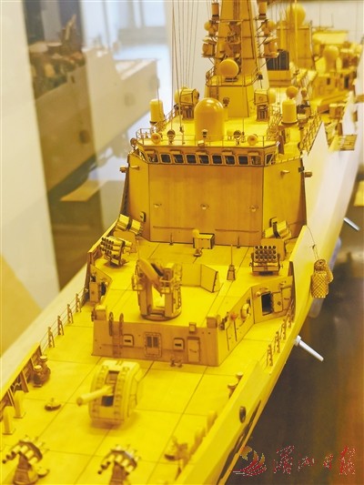 “广州号(168)导弹驱逐舰满载排水量7000吨,主尺度:155米、17米、6米,我的这个模型按照1:170比例制作。”郑然说,“广州号”是中国人民解放军海军“大型远洋驱逐舰”计划中的第一艘实用舰型,利用手中刻刀还原该舰,是他心中多年的梦想。