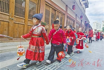 在花灯方阵,萌娃们身着各式各样的传统汉服,两两并排,神气地举着手中自制的精美花灯、传统年味儿的宫灯、充满童趣的兔子灯,浓浓的元宵味道扑面而来(如图)。