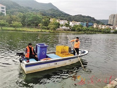 我市以河长制为抓手,加大巡河护河力度,打造河清岸绿生态美景。图为近日在泗华溪上,工作人员正在巡河护河。 全媒体记者 黄国清 摄