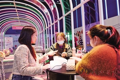 3月6日,一名女子在时尚生活节上体验美甲。国际劳动妇女节前夕,位于浙江省湖州市吴兴区埭溪镇的国际美妆时尚博览中心举办时尚生活节,为消费者打造融合美妆、科技、旅游的时尚体验。 新华社记者 翁忻旸 摄