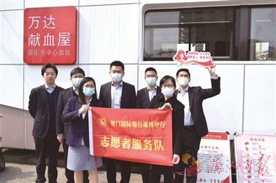 涓涓细流汇成江河,滴滴热血诠释爱心。为大力弘扬雷锋精神和“奉献、友爱、互助、进步”的志愿服务精神,做爱心传递的践行者、奉献者和守护者,营造向上向善的良好社会风尚,3月2日,厦门国际银行莆田分行组织志愿者服务队分批次赶赴市中心血站万达献血屋开展“无偿献血”公益活动,展现该行员工的大爱情怀(如图)。