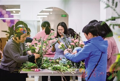 3月8日,游客在昆明斗南花卉市场体验插花。随着“三八”国际劳动妇女节到来,位于云南省昆明市的斗南花卉市场迎来了兔年春节后的又一个鲜花交易热潮。作为亚洲最大的鲜切花交易市场,斗南花卉市场年交易量超过110亿枝,成为我国鲜花交易的“晴雨表”“风向标”。 新华社记者 陈欣波 摄