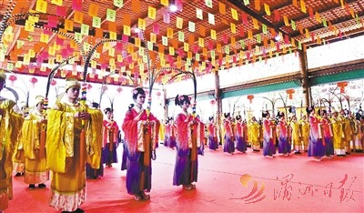 7日当天,湄洲妈祖祭典在和平下宫隆重举行。祖庙祭典团的男女舞生翩翩跳起八佾舞,呈现浓厚的海洋文化元素。