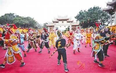 ▲图为妈祖英歌队在湄洲祖庙表演。