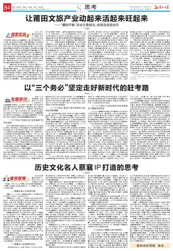 三、“莆阳开春”活动的模式特征,可以概括为“六个结合”。“莆阳开春”是一项系统工程,莆田市在推进“莆阳开春”活动中采取了“六个结合”举措:一是民生改善与文旅经济发展结合,主客共享;二是生态保护与文旅价值开发相结合,坚守生态底线;三是硬性项目与软性活动配套相结合,丰富要素衔接;四是异质空间与特色体验内容相结合,协调空间格局;五是保护传承与文化内涵创新相结合,激发文创活力;六是短期热点与长期持续发展相结合,挖掘深层价值。从理论上,这种模式可以概括为“以文旅为钥匙,以春节为时间开关,创新打开城市绿心价值、历史文化村落和古城古街价值,将文旅经济、基础设施建设、文化节庆、人居环境改善、生态保护、文化发掘、城市更新、乡村振兴等有机结合,探索莆田‘软起飞硬着陆’”文旅经济发展新模式。抓住关键时间,营造空间场景,打开时间开关和文旅开关,发挥文旅引流赋能功能,激活城市消费。