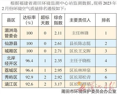 2月份各县区(管委会)环境空气质量排名情况