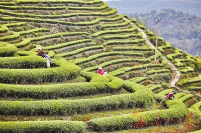 福建省连江县长龙镇茶农在采摘春茶。近日,福建省福州市连江县长龙镇2.36万亩高山茶园迎来采茶制茶时节。近年来,长龙镇依托高山自然环境,在做大做强传统种茶制茶产业的同时,茶旅融合发展乡村旅游,为乡村振兴注入了新活力。