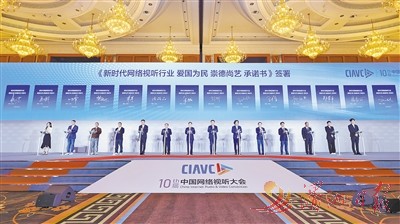 3月30日,在第十届中国网络视听大会行业发展与社会责任论坛上,行业代表签署《新时代网络视听行业爱国为民崇德尚艺承诺书》。大会举办行业发展与社会责任、网络视听高质量发展两个主论坛,以及涵盖防范未成年人网络沉迷、微短剧发展、网络公益、媒体融合发展等热点和前沿课题的100余场丰富多彩的活动。2000多家业界机构、500多名行业代表、近万名嘉宾齐聚成都,深度参与。 新华社记者 沈伯韩 摄