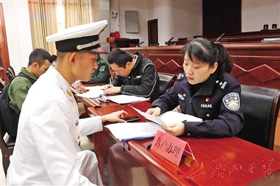 今春退役士兵陆续返乡报到,荔城区退役军人事务局联合有关部门开设退役军人“一件事”服务点,提供养老社保接续转移、岗位推介等服务。图为市公安局荔城分局户政民警为退役军人办理落户手续。 陈文华 摄