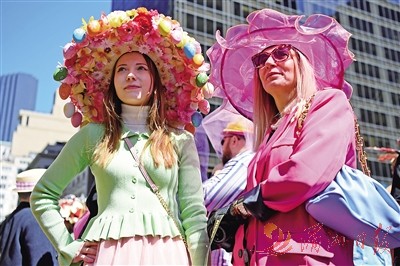 4月9日,在美国纽约,人们参加复活节花帽游行。当日是西方传统节日复活节,人们头戴精心制作的花帽,在纽约第五大道参加一年一度的复活节游行。 新华社记者 李睿 摄