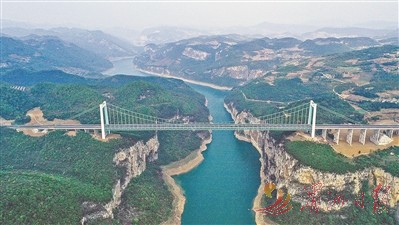 这是4月12日拍摄的金烽乌江大桥。日前,由贵州路桥集团承建的贵金古(贵阳经金沙至古蔺)高速金烽乌江大桥项目主桥建设已完工,开始为通车前的荷载试验做准备。金烽乌江大桥是贵金古高速公路项目的控制性工程之一,桥梁全长1473.5米。 新华社记者 杨文斌 摄