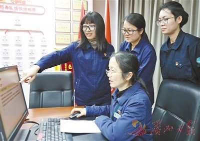 图为莆田供电公司青年党员讨论配网保护监视及评价系统应用工作。
