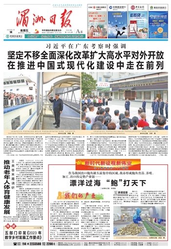 10日上午,习近平首先考察了位于湛江市东海岛的国家863计划项目海水养殖种子工程南方基地。习近平听取了广东省海洋渔业发展情况介绍,察看渔业良种展示,向现场科研和养殖人员询问选育技术、种苗长势、市场价格等。习近平指出,中国是一个有着14亿多人口的大国,解决好吃饭问题、保障粮食安全,要树立大食物观,既向陆地要食物,也向海洋要食物,耕海牧渔,建设海上牧场、“蓝色粮仓”。种业是现代农业、渔业发展的基础,要把这项工作做精做好。要大力发展深海养殖装备和智慧渔业,推动海洋渔业向信息化、智能化、现代化转型升级。