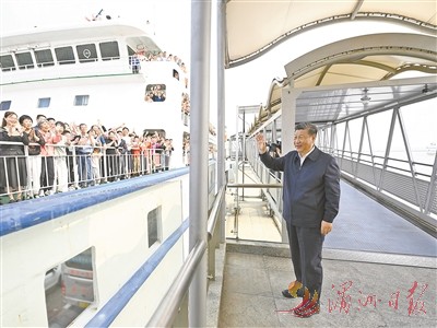 4月10日至13日,中共中央总书记、国家主席、中央军委主席习近平在广东考察。这是10日下午,习近平在湛江市徐闻县徐闻港泊位码头,向船上的旅客挥手致意。 新华社记者 燕雁 摄