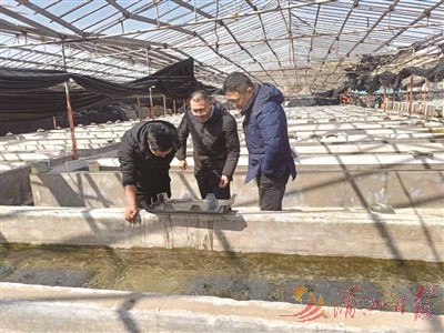 图为金融助理在养殖企业调研鲍鱼育苗情况