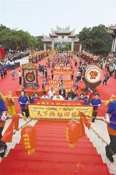 “擂鼓迎宾,恭迎天下妈祖回家!”随后,在雄壮的鼓声与飘扬的旗帜里,参加活动的妈祖宫庙及文化机构恭请分灵妈祖,拾阶走向祖庙天后宫,并在天后宫内举行三献礼。
