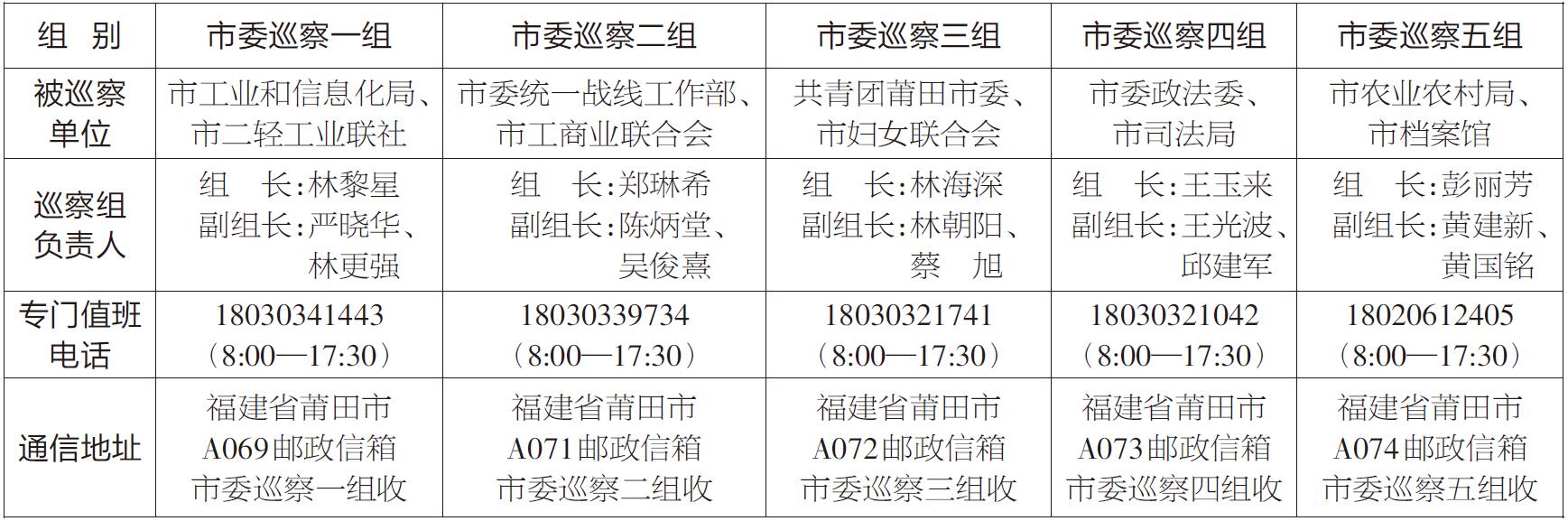 根据党中央关于巡视巡察决策部署及省委、市委工作要求,经市委巡察工作领导小组研究决定,从4月下旬开始,市委巡察组对市委统一战线工作部、市委政法委、市工业和信息化局、市司法局、市农业农村局、共青团莆田市委、市妇女联合会、市工商业联合会、市档案馆、市二轻工业联社党组织开展常规巡察,巡察时间40天左右。日前,巡察组已进驻巡察。
