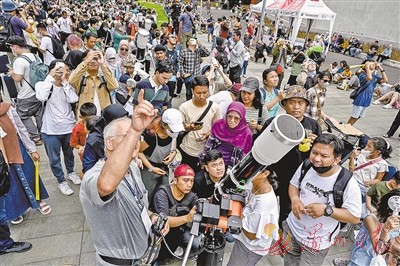 4月20日,人们在印度尼西亚雅加达观看日食。4月20日天宇上演一次比较特殊的日食——日全环食。同一次日食,如果一部分地区可见日全食,另一部分地区可见日环食,则称日全环食,又称“混合食”“复合食”,非常罕见。以21世纪为例,这100年中仅有7次日全环食发生。今年这次日食的食带很窄,在食带内两端会发生日环食,在中间是日全食。日食带从印度洋南部开始,经过澳大利亚的埃克斯茅斯、东帝汶东南部,印度尼西亚的巴布亚省,在太平洋西部结束。 新华社 发