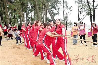 活动现场,通过悬挂横幅、设置展板、发放宣传资料等方式,让群众详细了解爱国卫生运动,并开展健身运动沙滩拔河比赛(如图)、爱卫宣传、专家义诊、沙滩卫生清洁志愿行动等,弘扬爱卫新风尚,积极推进创建卫生城镇,营造“爱祖国、讲卫生、树文明、重健康”浓厚氛围。