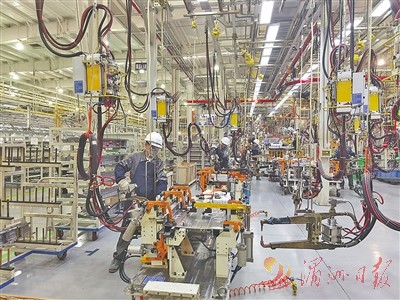 自从引入战略合作方,云度汽车通过品牌焕新、推出新车云兔等方式,不断扩大品牌影响力。图为该公司工人在焊装车间忙碌。 全媒体记者 林英 摄