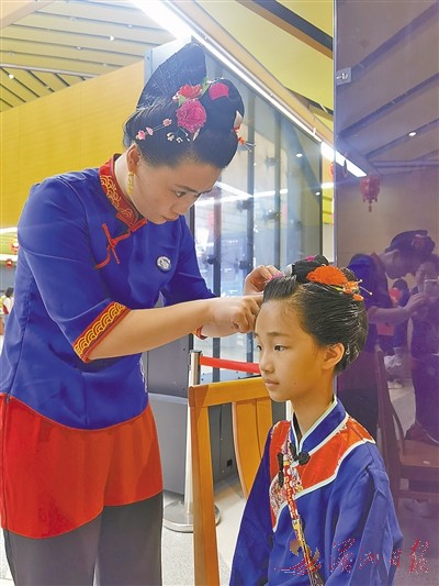 当日,在市图书馆的“妈祖文化长廊”,市图书馆典藏部工作人员翻阅地方文献精选段落,巧设有奖竞答题目,与读者共读妈祖文化经典,氛围热烈。值得一提的是,“妈祖髻体验摊”前更是排起了长龙,来自湄洲妈祖祖庙莆田会馆的工作人员为读者现场梳妈祖髻,读者们在现场妆造中,了解感受“帆船头,大海衫,红黑裤子寄平安”的独特寓意(如图)。