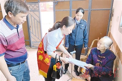 该区卫健局等部门还充分发挥大数据、网格化优势,依托“全市一张图”,加强政策宣传、优化理赔程序,深化“网格+为老服务”志愿服务活动,组织网格员、志愿者等深入村居,及时将保单发放到符合条件的老年人手中(如图),并同步为老年人及其家庭成员开展面对面政策再宣讲,确保出险老年人能得到及时有效赔付,提高政策知晓率、满意率,将好事办好、实事办实。
