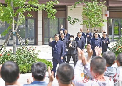5月10日,中共中央总书记、国家主席、中央军委主席习近平在河北省雄安新区考察,并主持召开高标准高质量推进雄安新区建设座谈会。这是10日上午,习近平在容东片区南文营社区考察时向社区居民挥手致意。 新华社记者 殷博古 摄