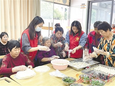 当天,在荔城区拱辰街道濠浦社区长者之家,参与活动的老人们早早地来到现场。在工作人员和志愿者的陪护下,他们积极参与套圈游戏,重温童年快乐的回忆,现场充满了欢声笑语。随后,大家开始共同制作春卷、豆丸、炝肉汤等传统特色美食(如图)。老人们积极展示自己的厨艺,他们分工协作、各尽其责,干得“热火朝天”,不一会儿,便制作完成并现场烹煮。品尝着美食成果,老人们的脸上露出幸福的笑容。活动中,志愿者们还陪老人们拉家常、讲笑话,满足空巢老人的精神需求,让老人不孤单。