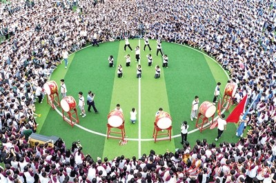 近日,湖北省宣恩县第一高级中学学生在快闪活动中表演鼓舞。高考临近,多地学校组织形式多样的“花式减压”活动,帮助高三学生释放身心压力,以更乐观、更自信的心态迎战高考。 新华社 发