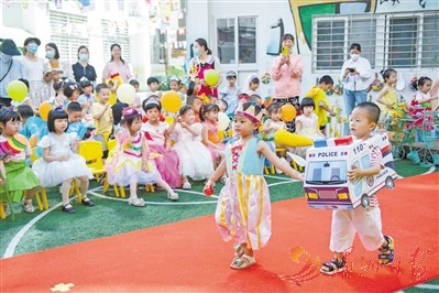 ▲5月30日,市第二实验幼儿园开展丰富多彩的趣味活动。图为该园小班段“童心遇童话”走秀活动。 黄佳丽 许金珊 摄