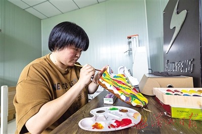 设计师对照AI生成的图案为定制鞋上色。 全媒体记者 陈斌 摄
