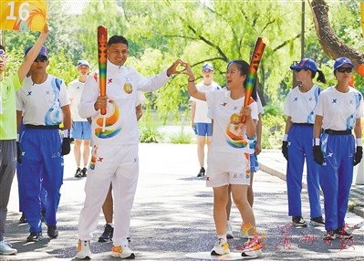 6月10日,火炬手艾克森(前左)与杨倩(前右)在火炬传递中交接。当日,成都第31届世界大学生夏季运动会火炬传递启动仪式在京举行。成都大运会火炬传递的主题是“奋斗青春·放飞梦想”,共有800名火炬手、100名护跑手参与。新华社 发