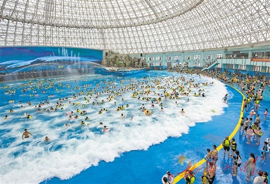7月8日,游客在安徽省芜湖市南陵县大浦乡村世界的海啸馆戏水游玩。炎炎夏日,人们戏水游玩,乐享清凉。 新华社 发